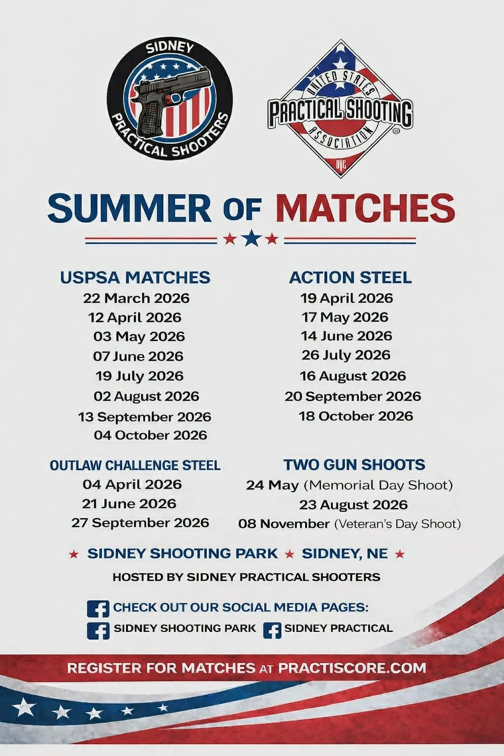 Sidney Shooting Park hosts multiple shooting competitions each month for nine months out of the year. USPSA competitions are held the first Sunday of each month. Other competitions like Action Steel and Two Gun are also held. Visit the calendar page for the schedules.